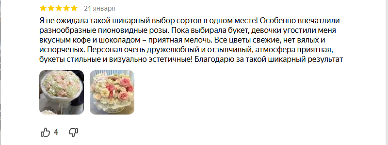 Чем больше людей ставят высокие оценки и пишут положительные отзывы о цветочном салоне, тем лучше он продвигается в выдаче и оказывается выше конкурентов. Очень важно своевременно отвечать на оставленные отзывы, стараясь использовать ключи из семантического ядра.