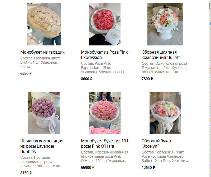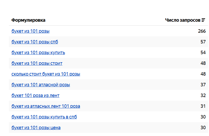 Стараемся включать ключевые запросы в название и описание букетов. Для этого можно воспользоваться бесплатным сервисом «Вордстат». Он показывает, сколько раз пользователи искали информацию по тому или иному запросу.