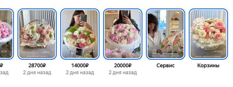 Проанализировав поведение пользователей, которые ищут цветочный магазин, мы поняли, что они зачастую нажимают на предлагаемые букеты. Им интересно, как выглядят цветы и сколько стоит готовый букет. Поэтому в истории можно закрепить актуальные предложения с указанием цены. Фотографии должны быть качественными и привлекающими внимание.
