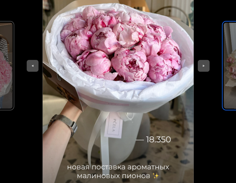 Вот пример истории, которая продает. Указали, что это новое поступление пионов (один из самых востребованных цветов), красиво оформили и не скрыли цену.
