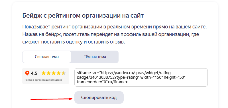 Бейдж с рейтингом организации можно найти в Яндекс Бизнес, перейдя в раздел «О компании» и нажав на промоматериалы. Ниже находится вкладка «Карта на сайт». Там можно скопировать код и вставить на сайт салона, чтобы клиенты быстрее могли вас найти на картах. Ее можно кастомизировать, нарисовав вход или выделив объекты.