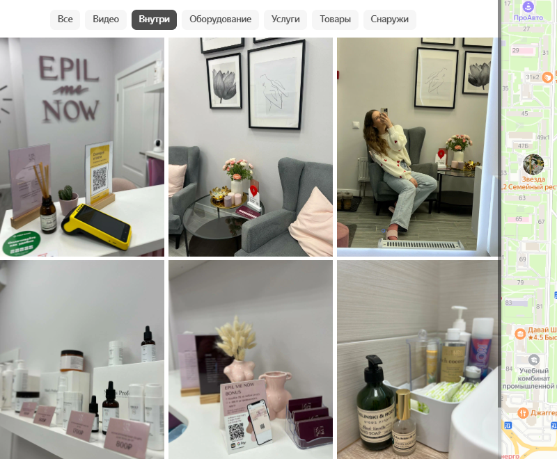 В Яндекс Бизнес это категория «Экстерьер», в которую можно загрузить фотографии внешнего вида здания студии. Многие люди перед посещением организации хотят понимать, куда именно идти, как выглядит вывеска компании, где вход, есть ли парковка, в каком здании находится салон красоты. Чтобы посетитель не заблудился и не передумал покупать услугу, добавьте несколько фотографий в экстерьер.