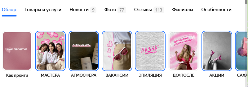 Раздел «Истории» нужен для наглядного и быстрого представления важной информации людям, которые ищут студии красоты или конкретные услуги на Яндекс Картах. С помощью сторис можно решить ряд задач: