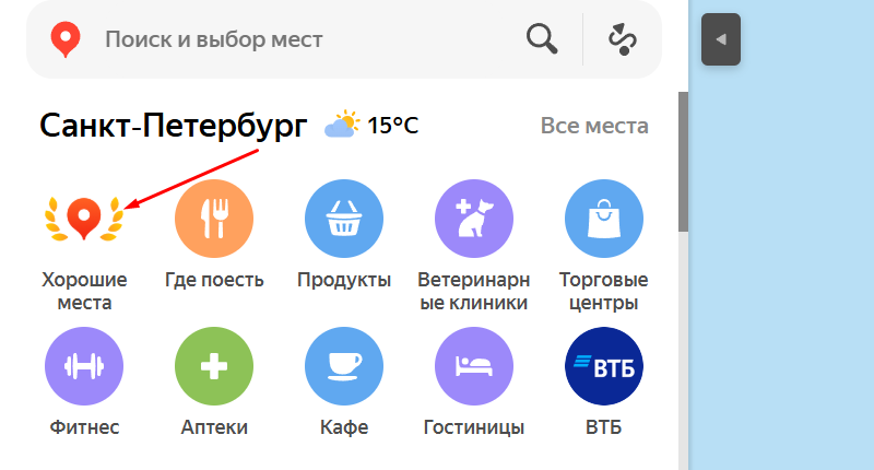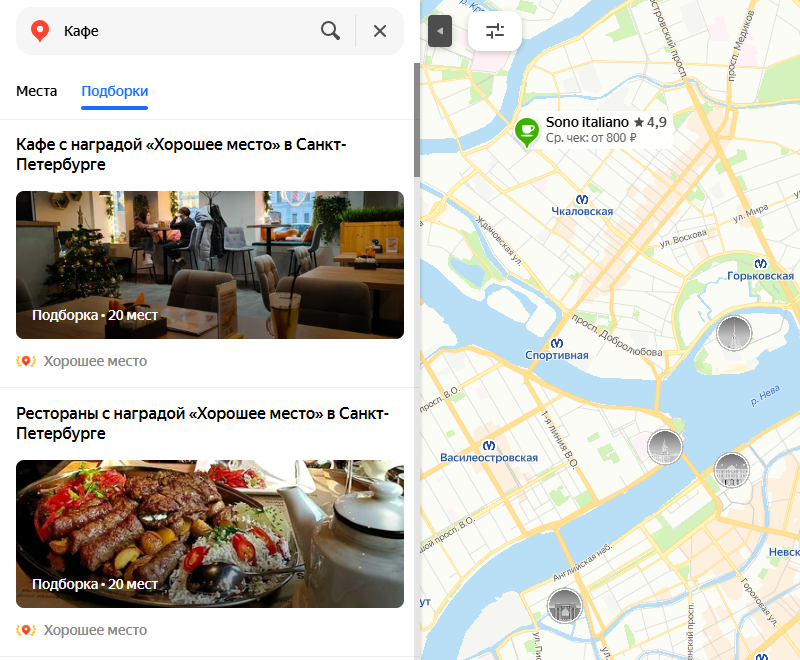 - Попадание в подборку на Яндекс Картах. Например, при выборе или вводе «Кафе» в поисковую строку, можно нажать на подборки и посмотреть все организации с отметкой «Хорошее место».